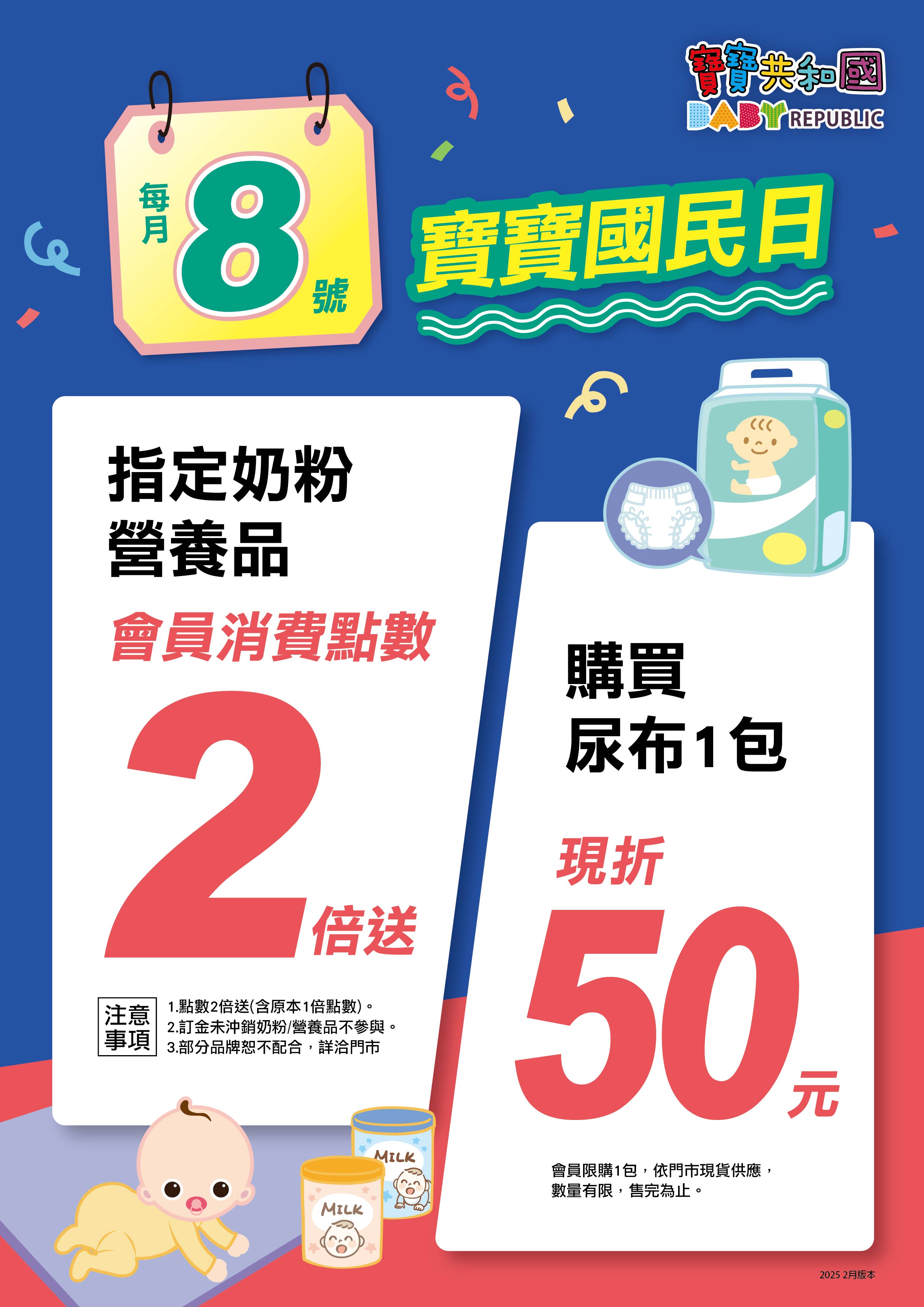 1.指定奶粉/營養品點數2倍送 2.尿布1包現折50元 ※點數2倍送(含原本1倍點數)。訂金未沖銷奶粉/營養品不參與。