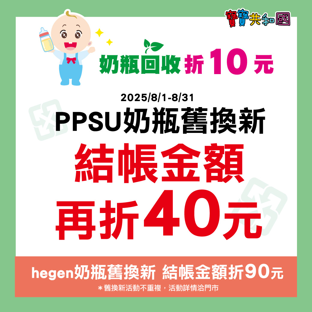 ※PPSU回收最高折50元:含原回收活動折10元(可折抵任一消費)+加碼汰舊換新折40元(限折抵回購奶瓶)。
