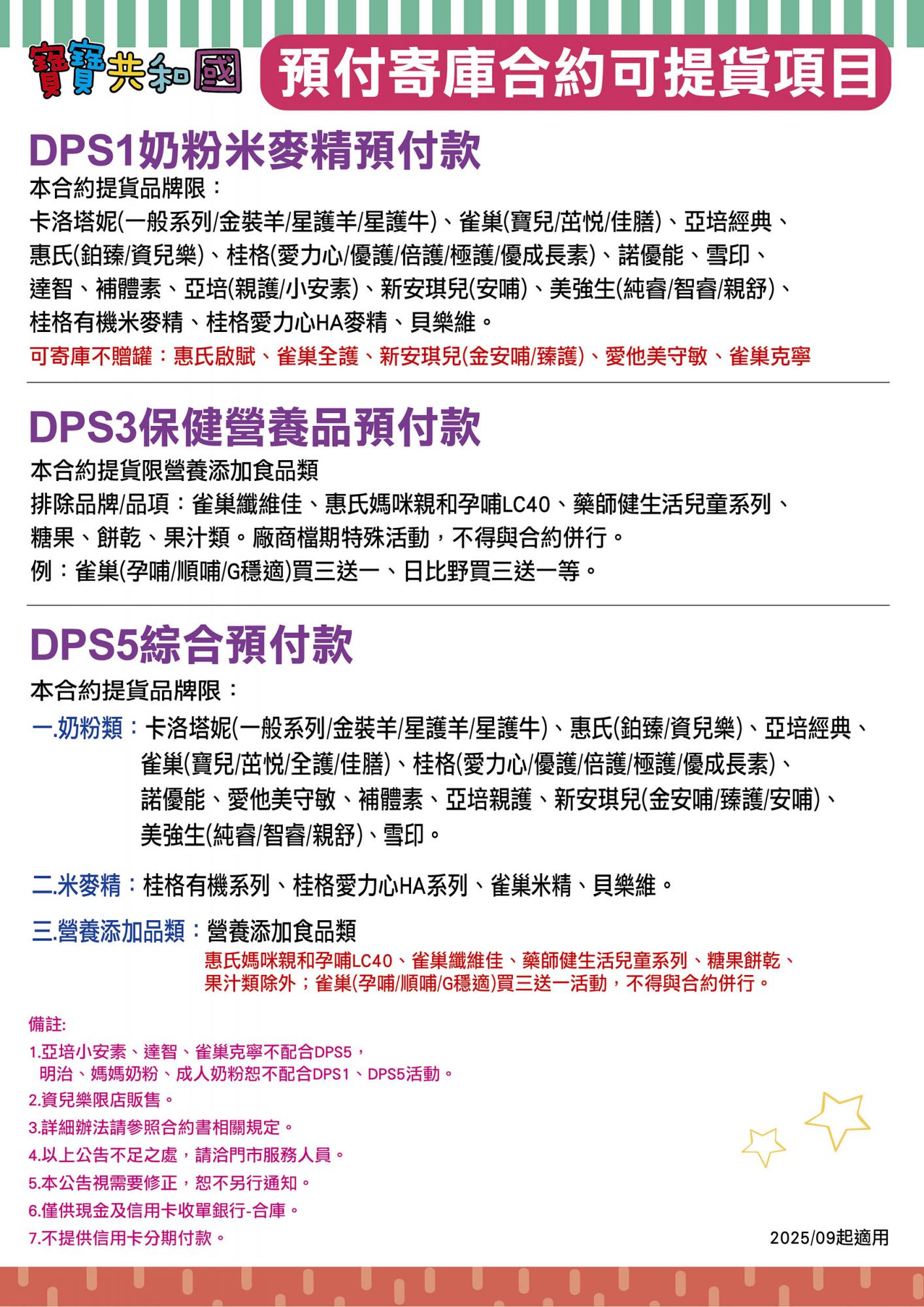 ※亞培小安素、達智、雀巢克寧不配合DPS5, 明治、媽媽奶粉、成人奶粉恕不配合DPS1、DPS5活動。