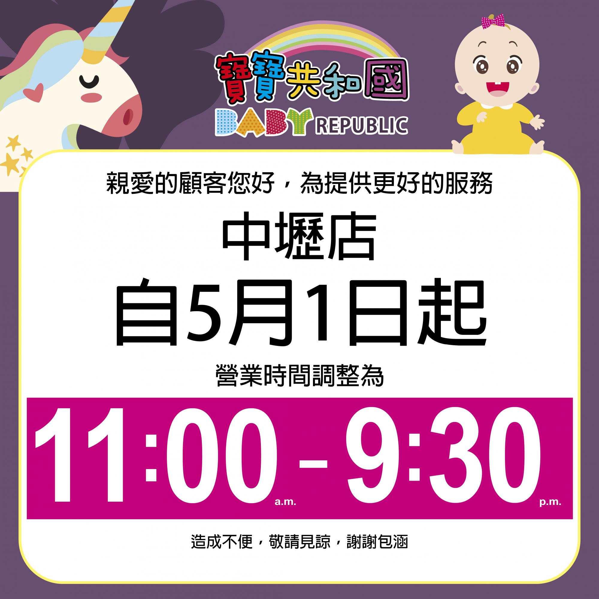 寶寶共和國【中壢店】營業時間調整 親愛的顧客您好: 為提供更好的服務 中壢店自114年5月1日起 營業時間調整為11:00AM-09:30PM